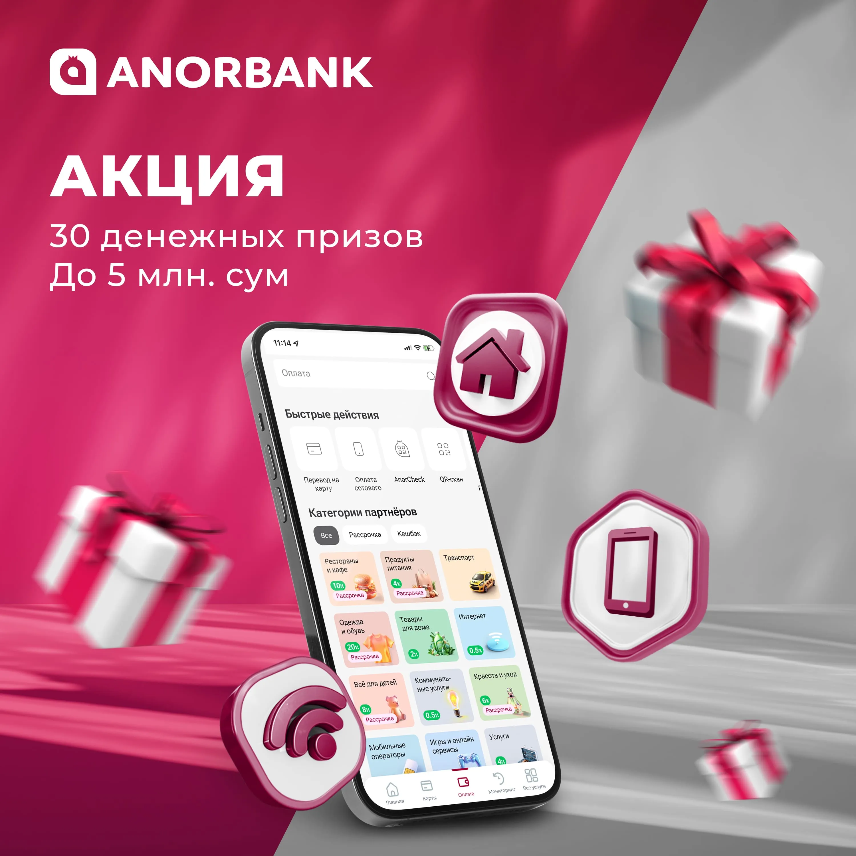 Оплачивайте за коммунальные услуги, мобильную связь и интернет с 20 ноября по 31 декабря в приложении Anorbank и получите возможность стать одним из 30 победителей денежного приза с фондом в 30 000 000 сум.