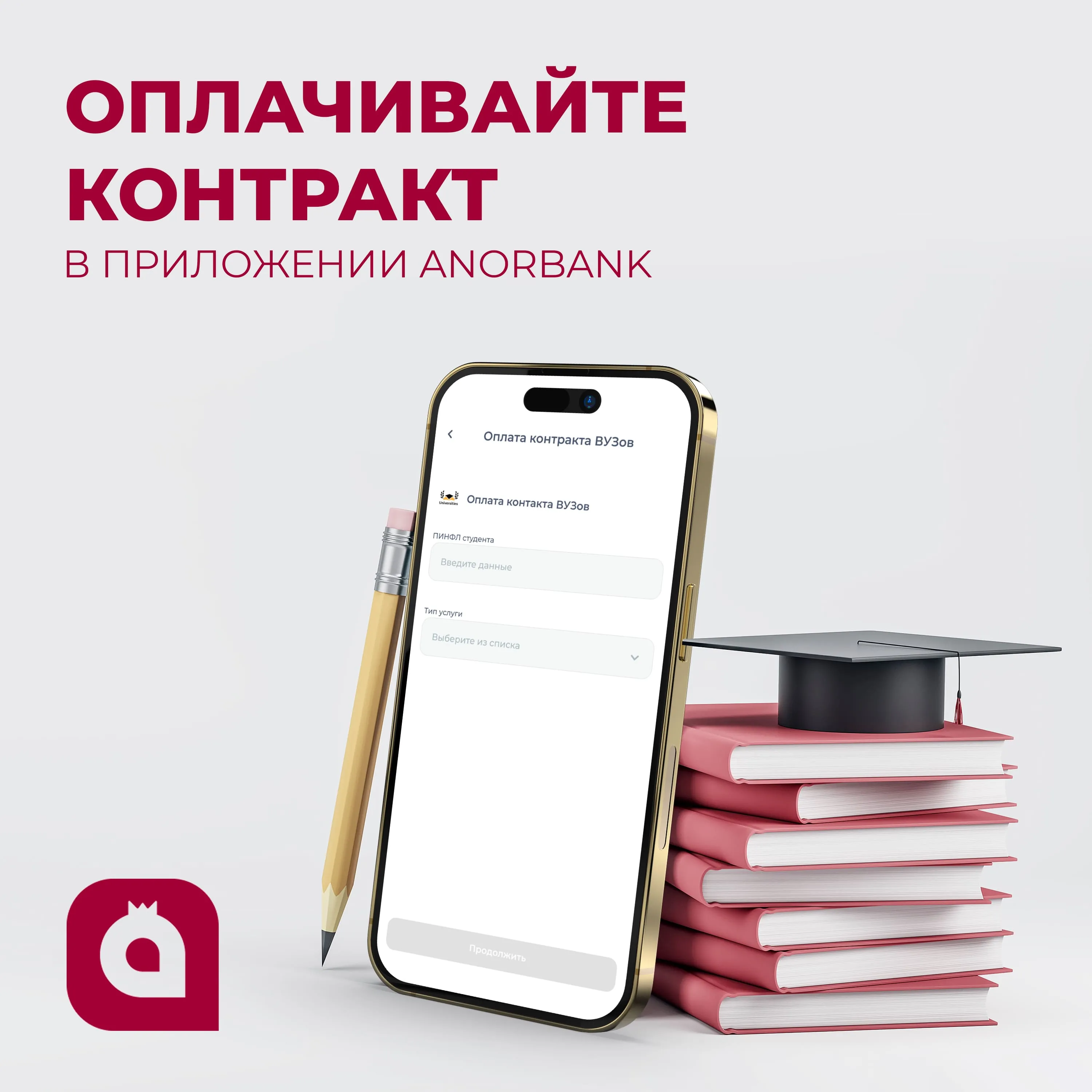 Не нужно обращаться в кассы банков с договором, теперь вы можете это сделать в нашем приложении Anorbank без комиссий в любой государственный ВУЗ и мониторить общую задолженность и последние транзакции оплат.