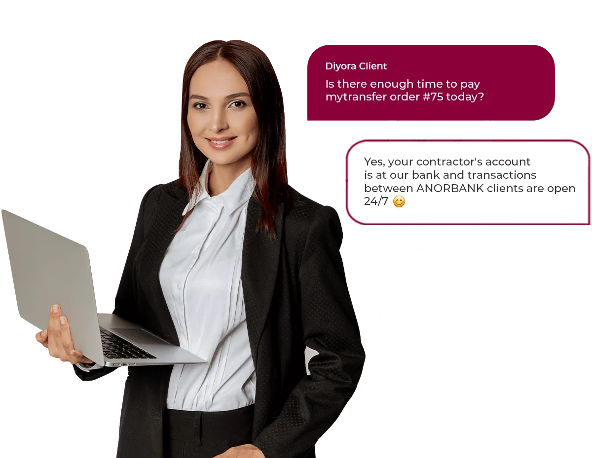 Online account opening, tariff management, cards ordering, payroll programme opening, 1C integration, electronic document management, etc., are available in ANORBANK online banking.