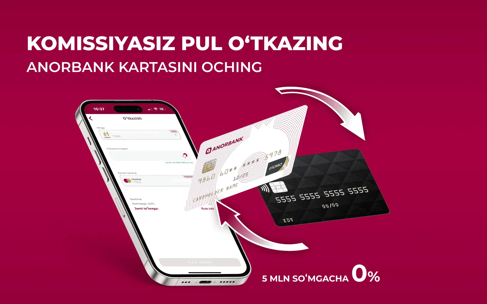 Endi, birinchi bor ANORBANK jismoniy kartasini ochganingizda, pullaringizni komissiyasiz o‘tkazish imkoniyatiga ega bo‘lasiz!