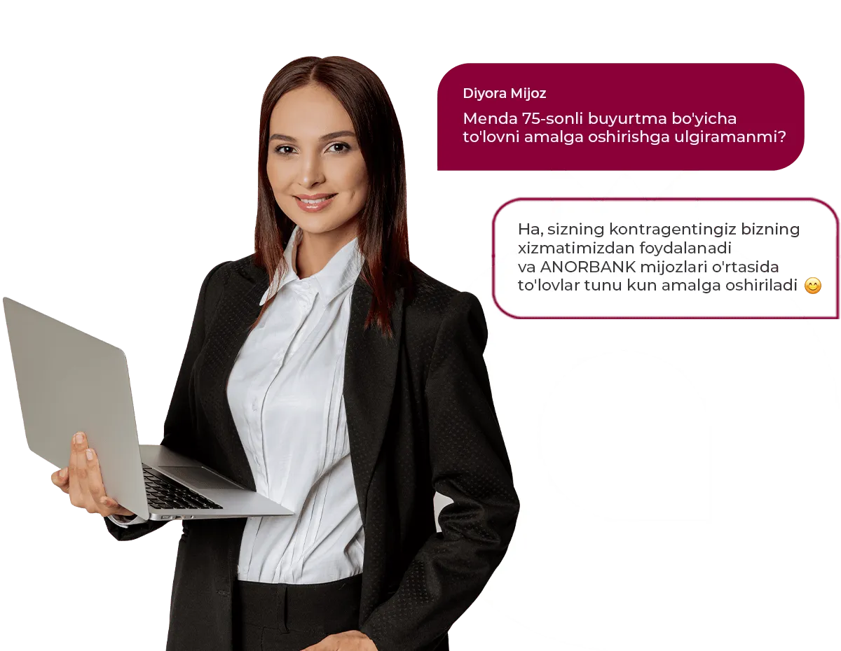 ANORBANK ning Internet-bankida onlayn hisob raqam ochish, tariflarni boshqarish, ish haqi loyihasiga ulanish,1С bilan integratsiya, elektron hujjat almashinuvi va ko'pgina boshqa xizmatlardan foydalanish.