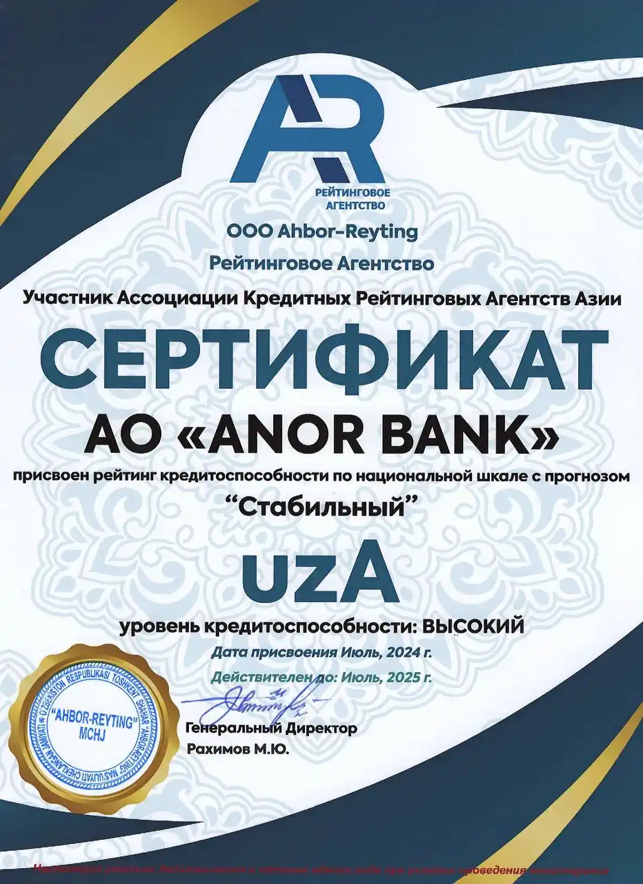 Национальное агентство Ahbor-Reyting присвоил нашему банку рейтинг кредитоспособности по национальной шкале на уровне «uzA» с прогнозом «Стабильный» по результатам 2023 года.