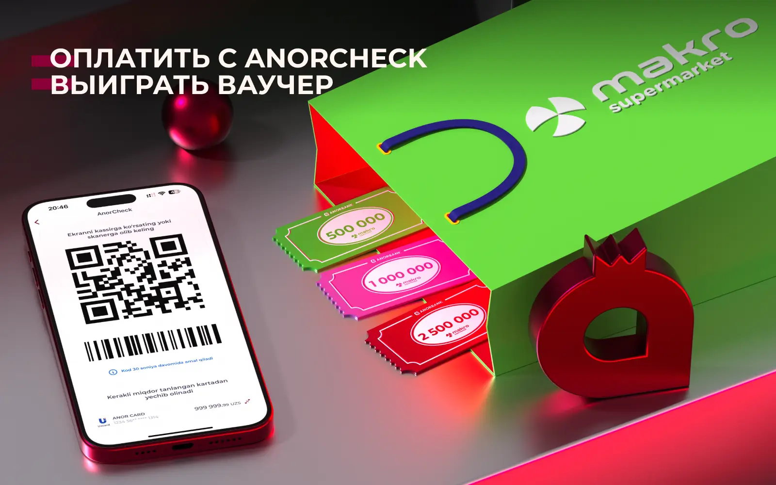 Совершить транзакцию в сети партнера Makro посредством бесконтактной оплаты AnorCheck на сумму от 100 000,00 сум до 23:59 часов последнего дня проведения акции.