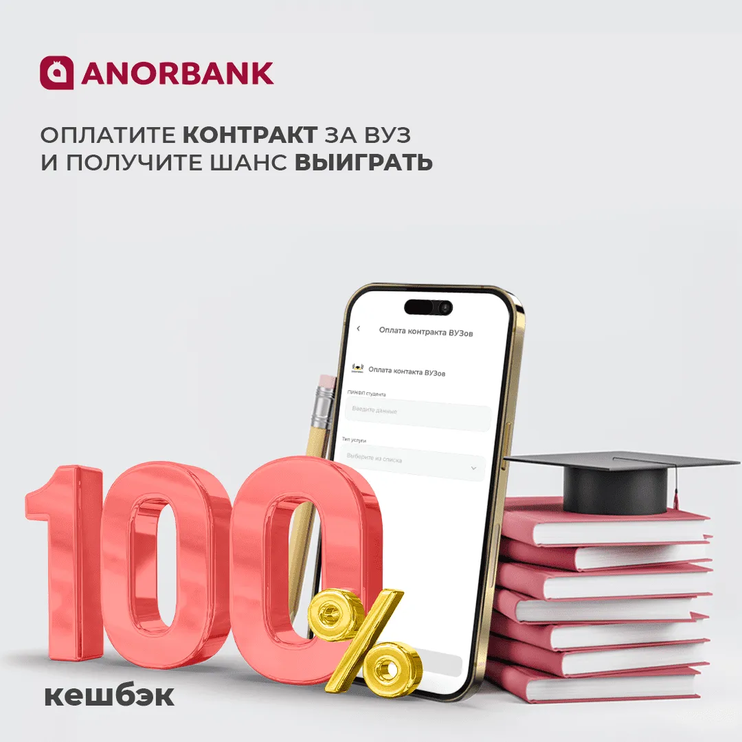 Хорошие новости для студентов. Теперь, оплачивая контракт за государственный ВУЗ через приложение Anorbank, вы получаете шанс выиграть до 100% кешбэка от суммы вашей оплаты.