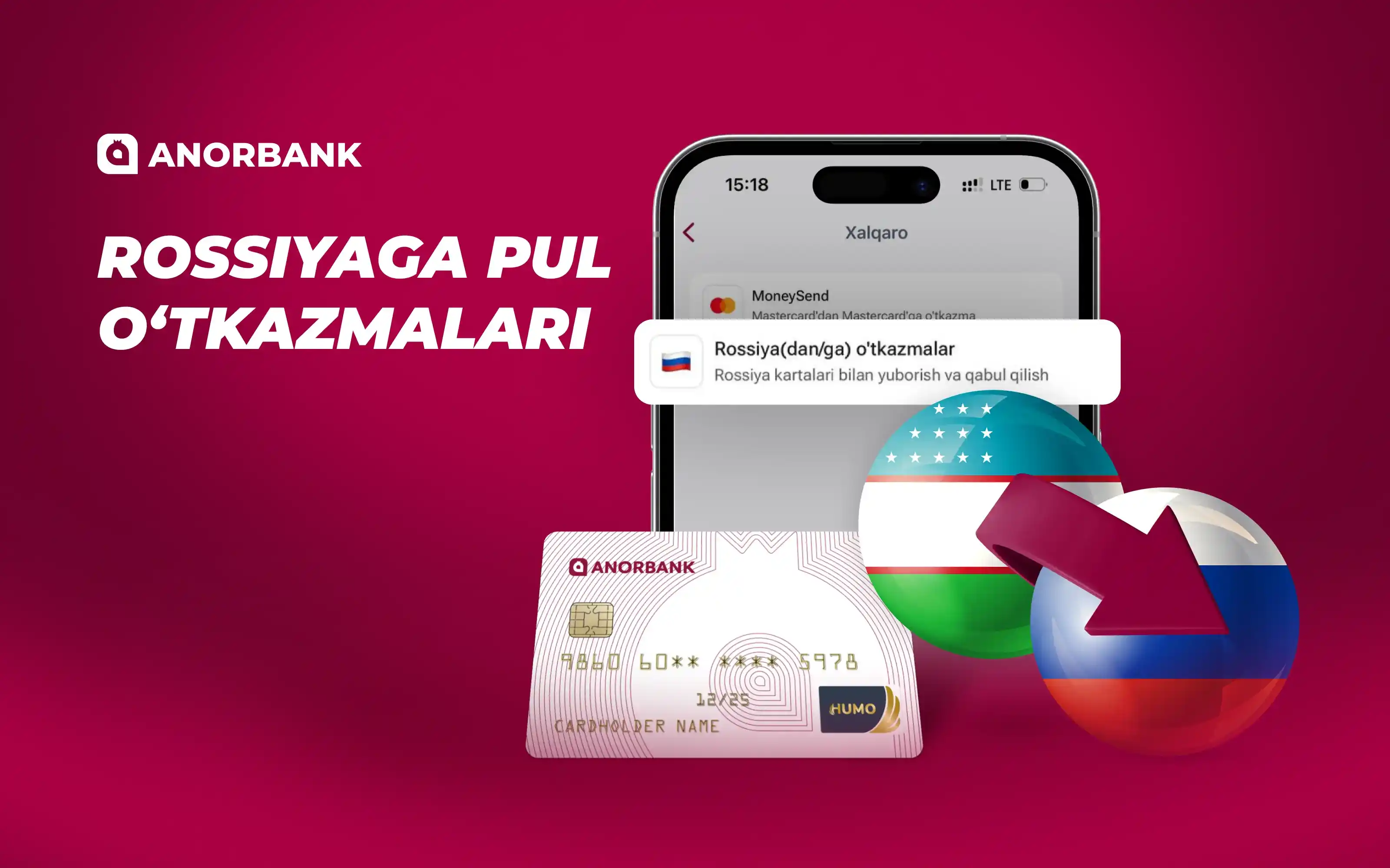 Anorbank xalqaro pul o‘tkazmalari imkoniyatlarini kengaytirmoqda. Endi Rossiyaga pul jo‘natish xuddi qabul qilish kabi oson — komissiyasiz, zudlik bilan va qulay kurs bo‘yicha.